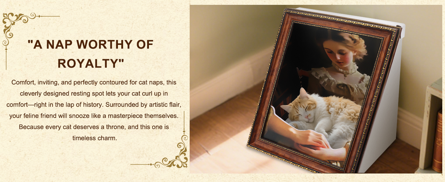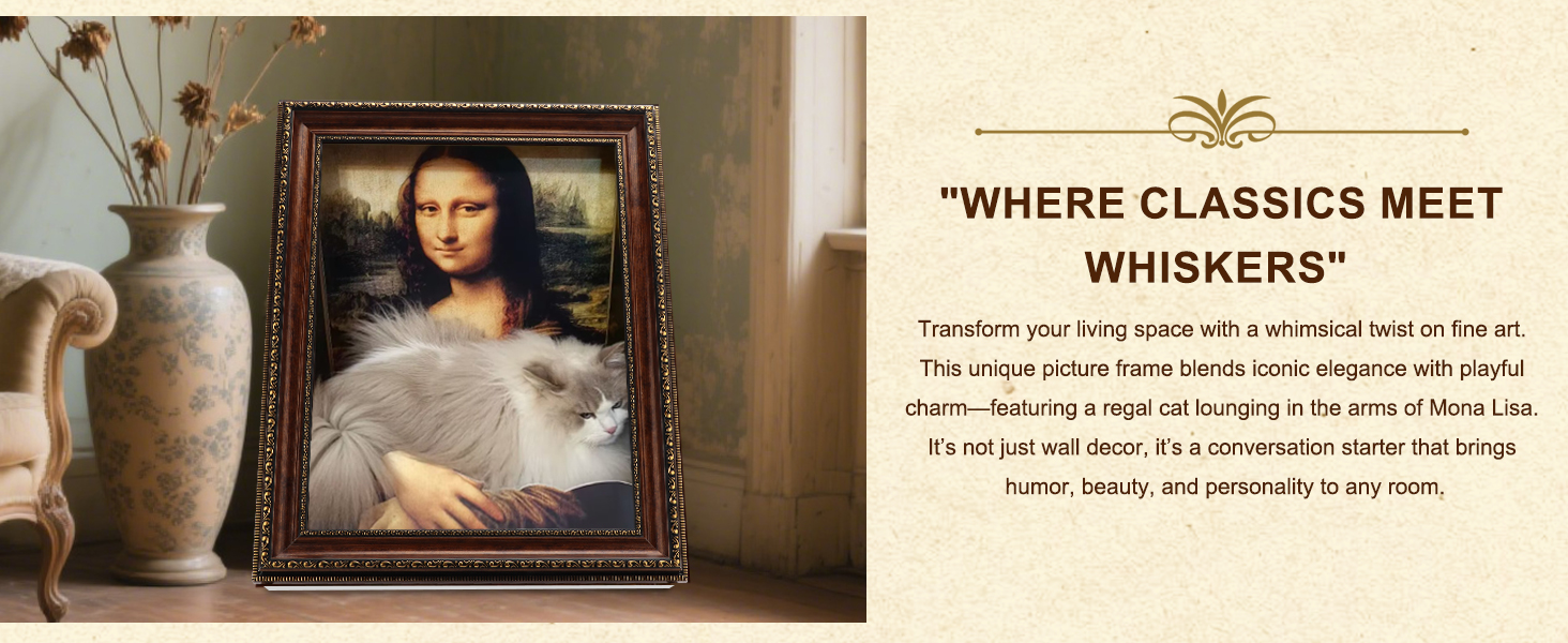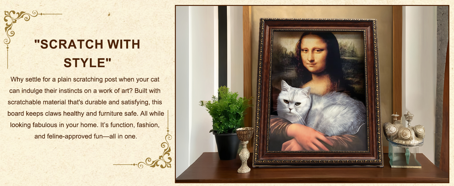 - Interactive Art & Photo Prop: The Mona Lisa-themed backdrop and classic art frame combine with a cozy cat bed for an elegant piece. Features a clever optical illusion of Mona Lisa holding your cat, create charming 3D photo moments with your cat, inspired by art and perfect for home decoration.